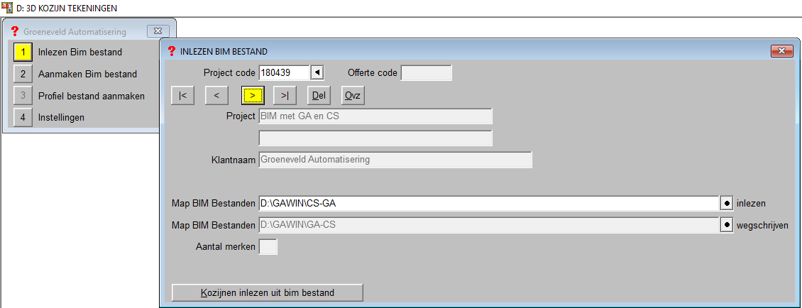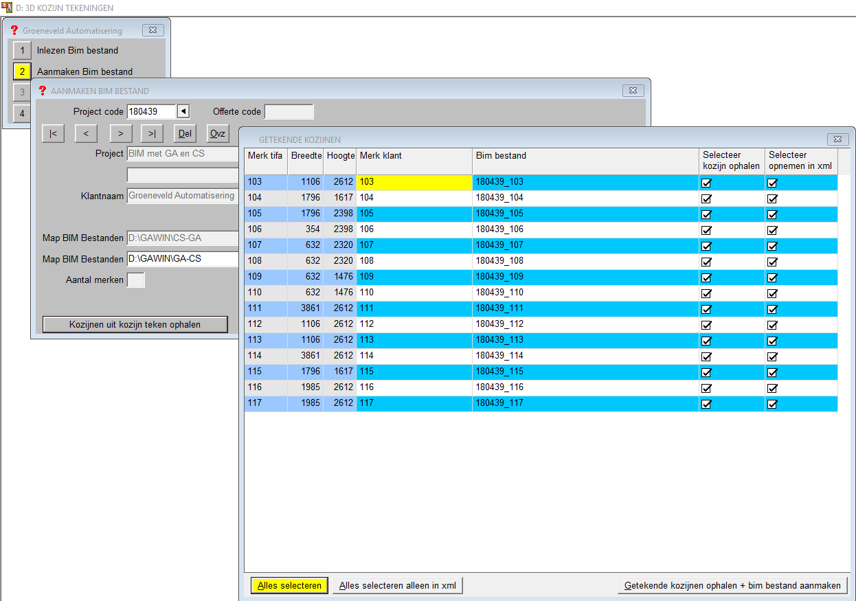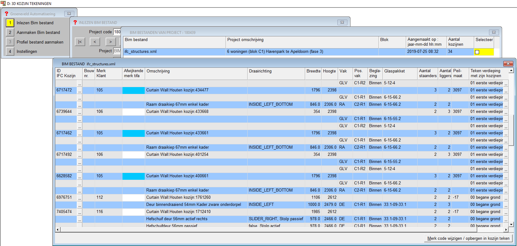 Tevens is het mogelijk indien het BIM model aangeboden is om de tekeningen uit een XML bestand in te lezen in deze module en door te zetten richting tekenen zodat u niet de kozijnen opnieuw hoeft in te voeren in kozijn tekenen.