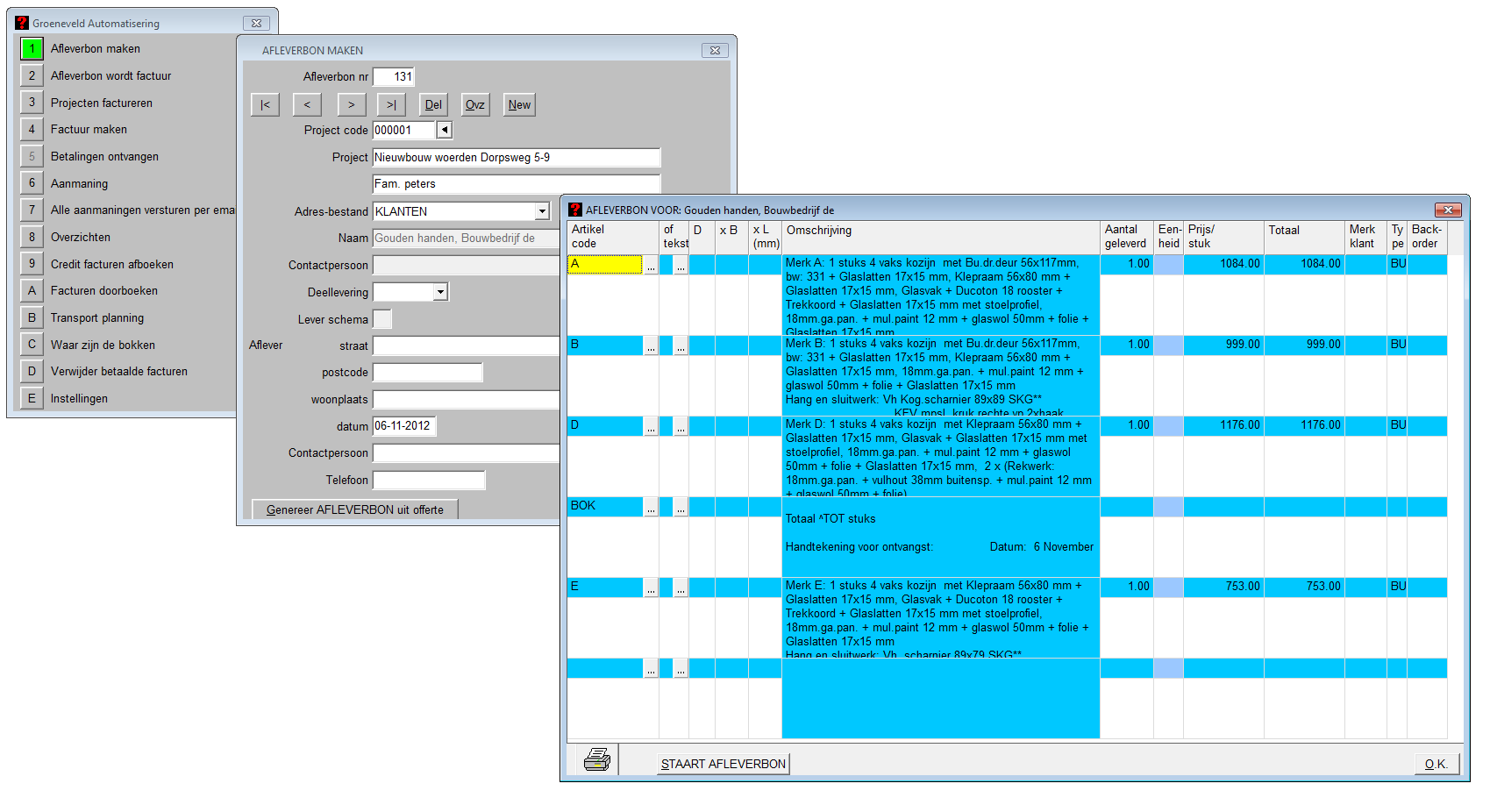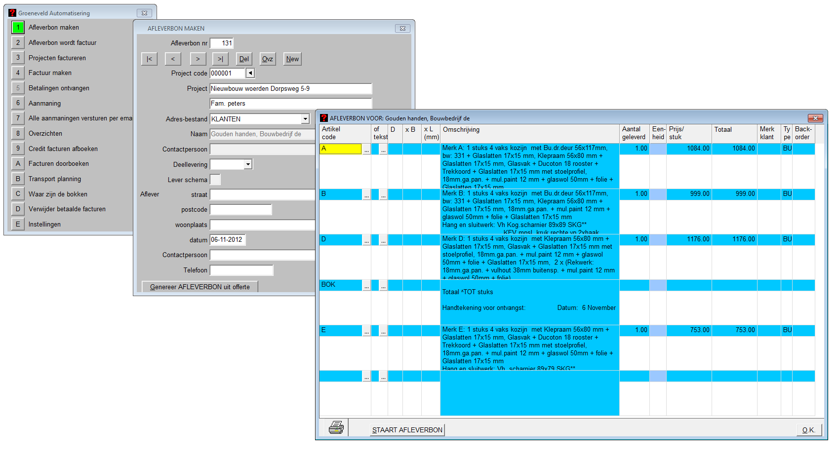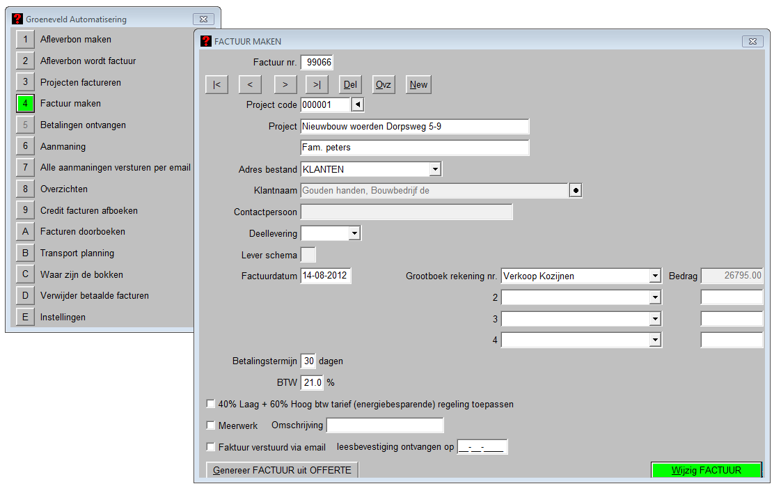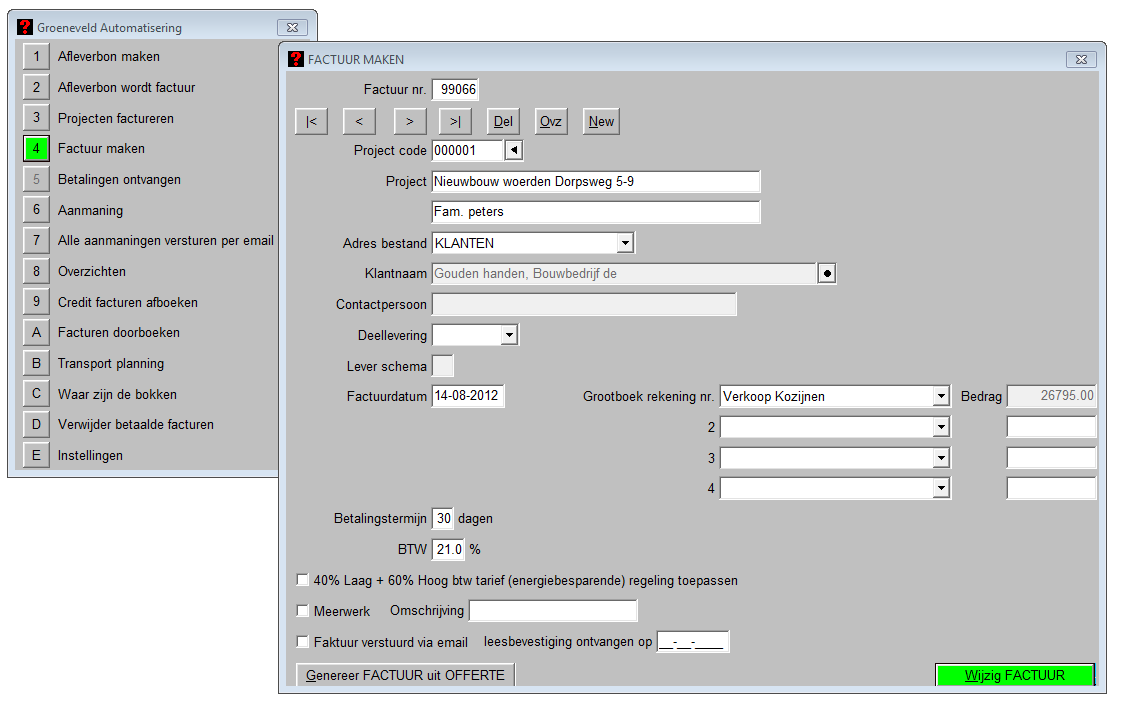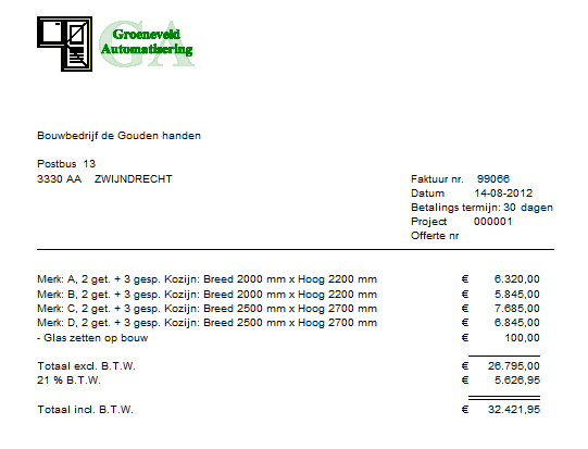 U kunt de factuur en/of afleverbonnen aanmaken vanuit de offerte, daarnaast kunt u ook nog losse onderdelen factureren. De betaalde facturen kunt u afboeken, van de openstaande facturen kunt u aanmaningen uitprinten of gelijk mailen.